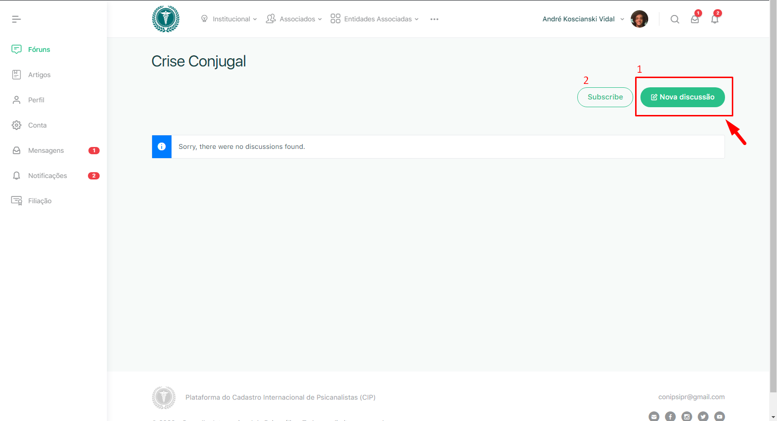 2 – Agora que você já escolheu o fórum ideal para a sua publicação, clique no botão verde “Nova Discussão” que está no canto superior direito. (Botão número 1). Você também pode clicar no botão “Subscribe” (número 2) para receber um e-mail toda vez que uma nova publicação for feita nesse fórum.